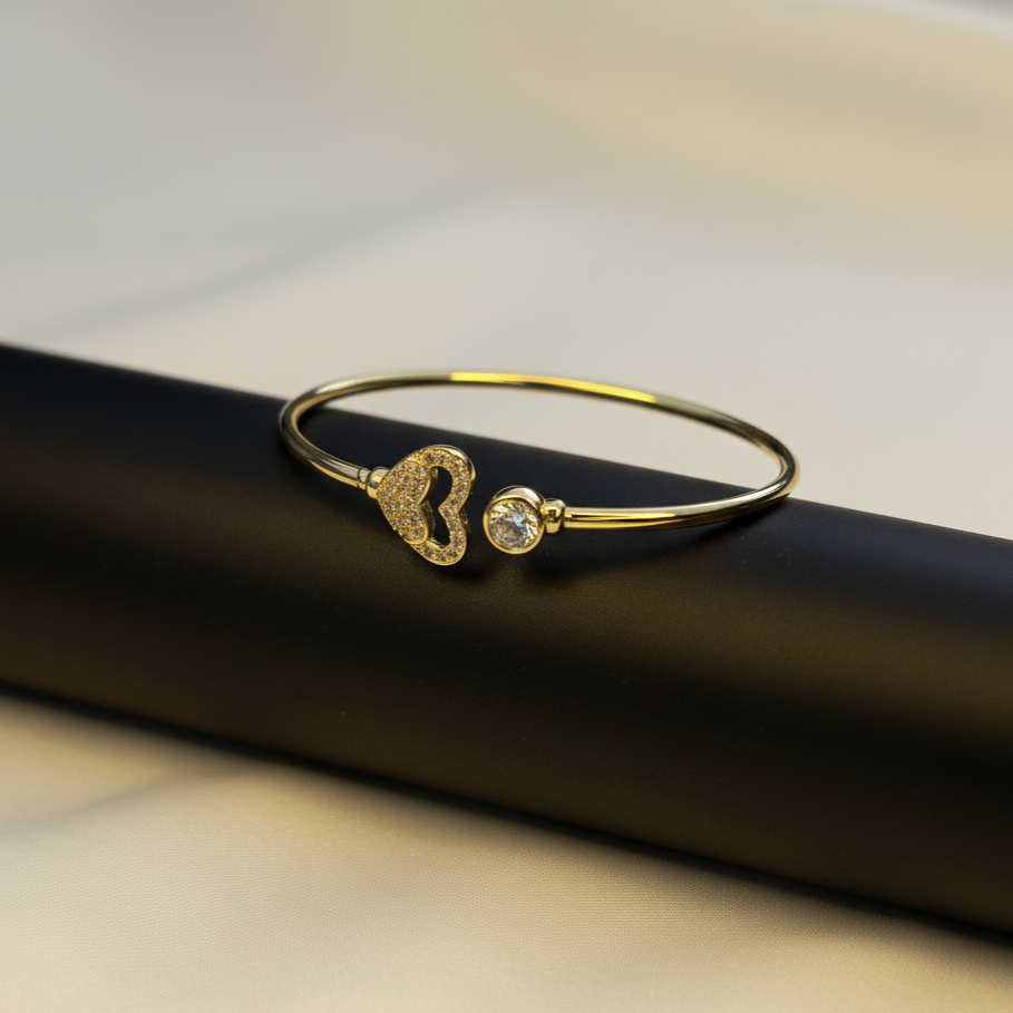 Key Features: – Color: Gold-tone with clear crystal accents. – Style: Elegant open bangle with a heart and crystal embellishment. – Formal/Informal: Perfect for both casual wear and special occasions. – Perfect For: Romantic gestures, date nights, or everyday elegance. – Lightweight: Comfortable for long-lasting wear. – Versatility: A delicate piece that complements a variety of outfits. – Secure Fit: Easy to wear with a flexible design for a snug fit.